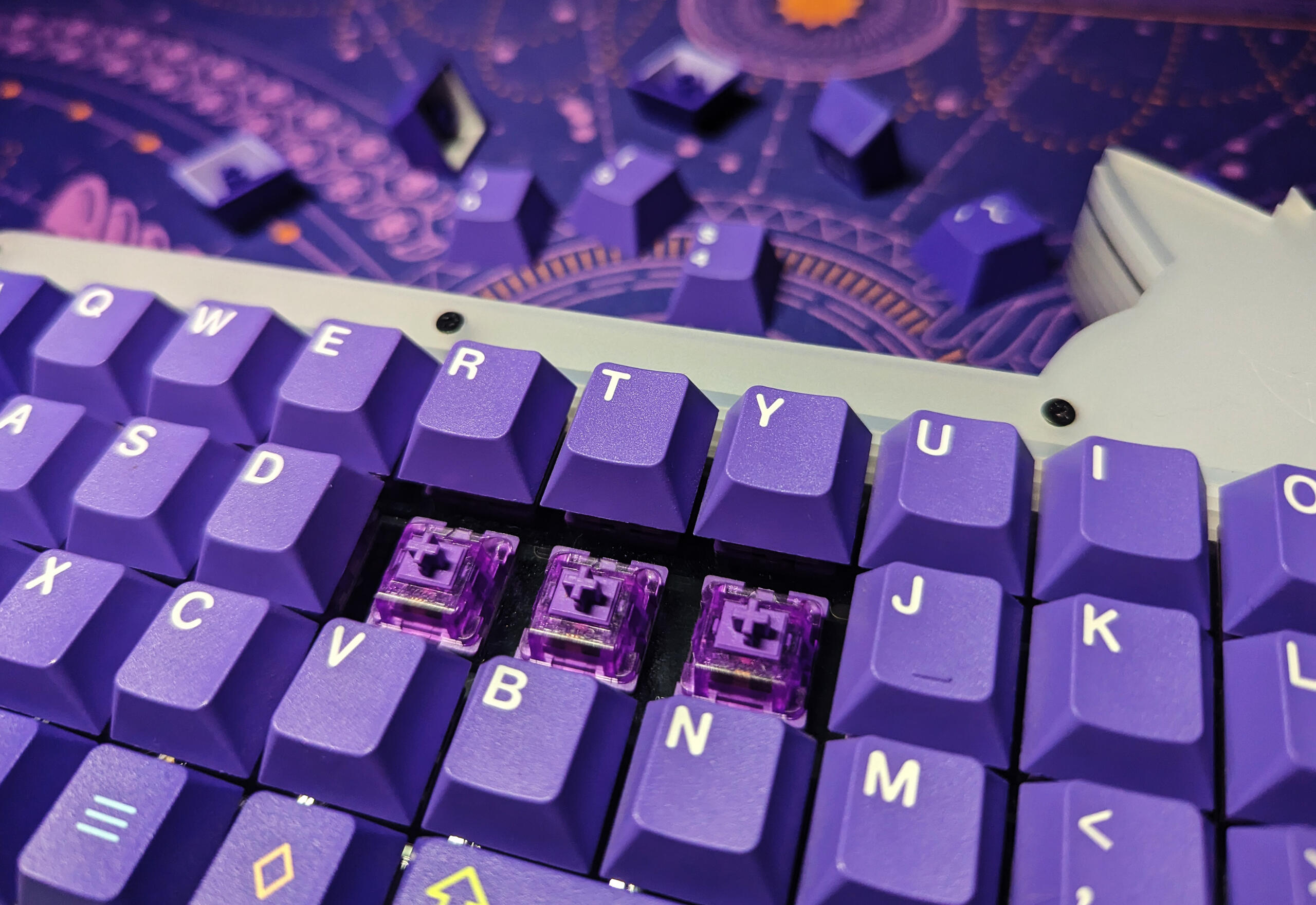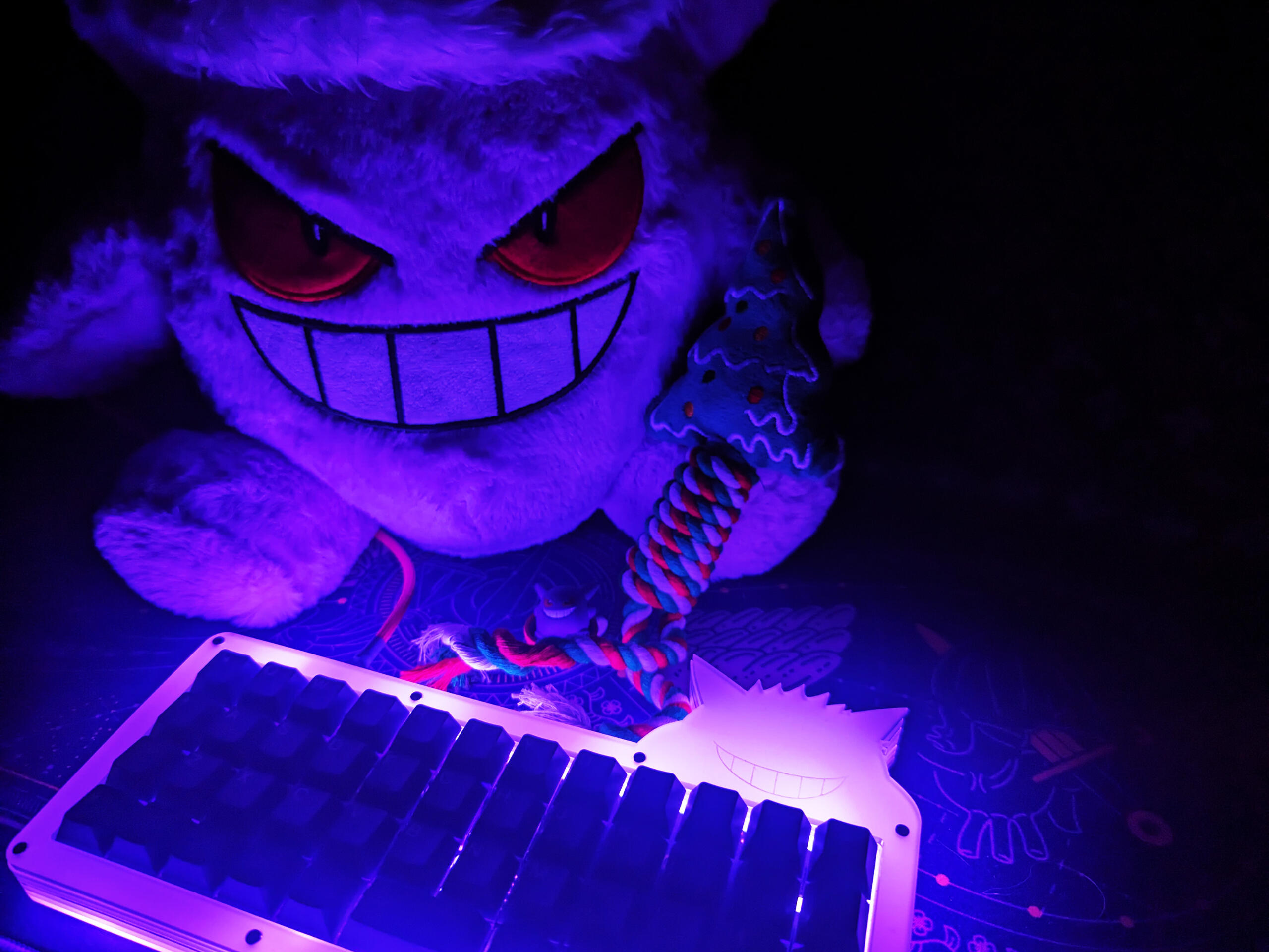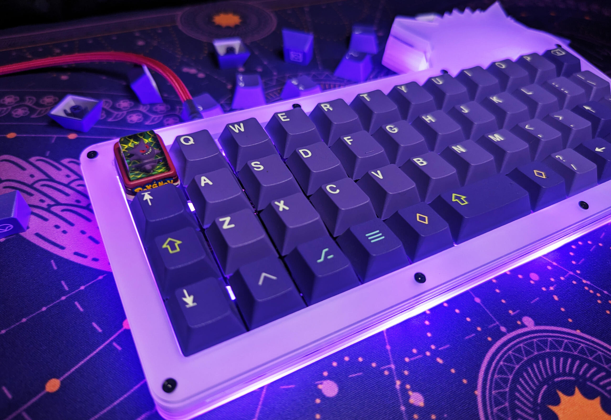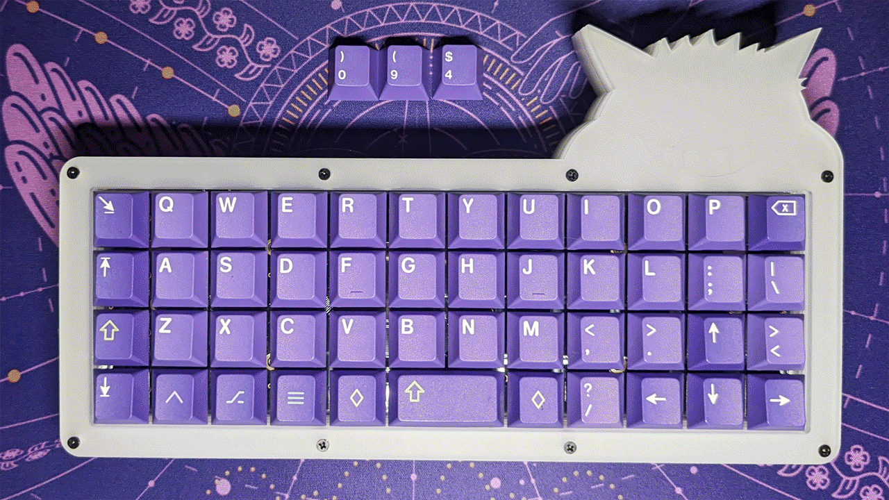 PCB: olkb Planck V6 スイッチ:Akko Lavender Purple キーキャップ: GMK Serenity アルチザン: Dwarf Factory × Pokemon ケース:アクリル積層 プレート:アクリル(サンドウィッチマウント) デスクマット:Equilibrium